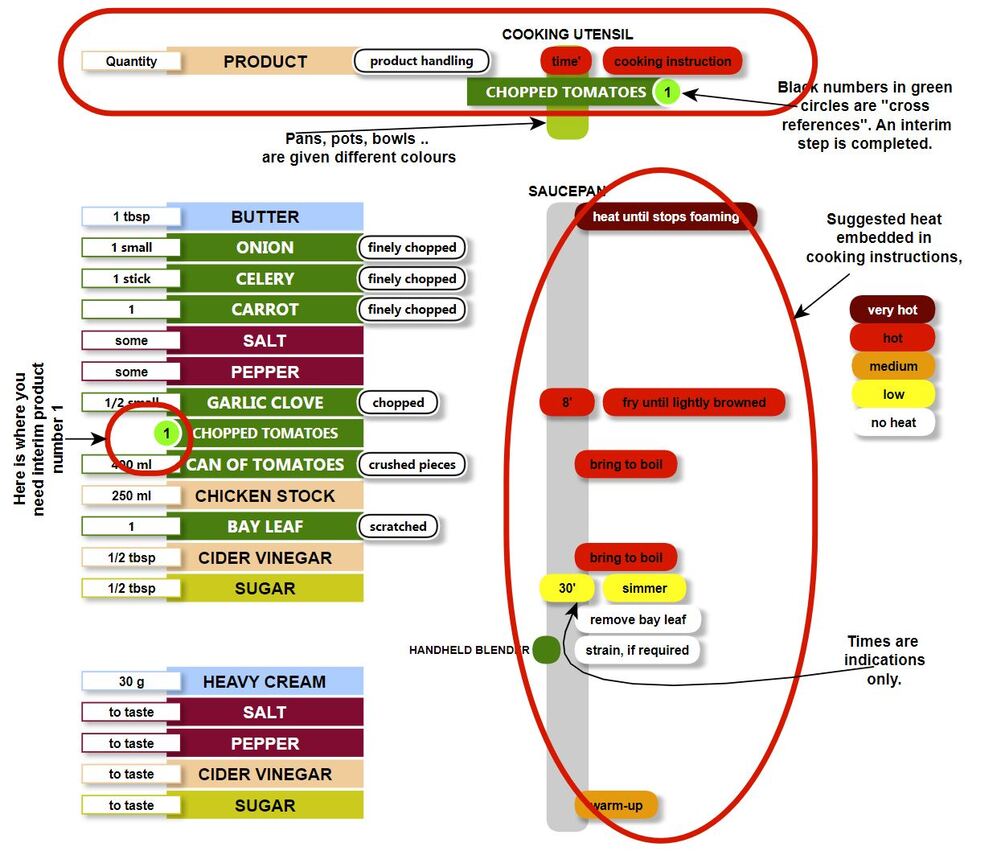 A unique and universal recipe format. Cooking from top left to bottom right. Over 100 recipes of renown chefs in a new format. Winning the race against the arrival time of your guests.