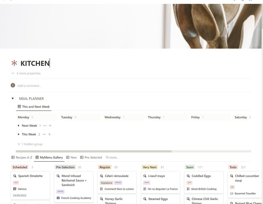 I am a collector, user and writer of cooking books. For 15 years I was organizing my recipes, cooking books, selections on paper, renewing my notes every now and then in time consuming efforts. NOTION opened the door to create my Food Court which I am using daily for selecting the dishes I want to do (next, some time, eventually, try,....), putting together the menus I offer my family and my guests and organizing my collections and any ideas or food related items I come across.