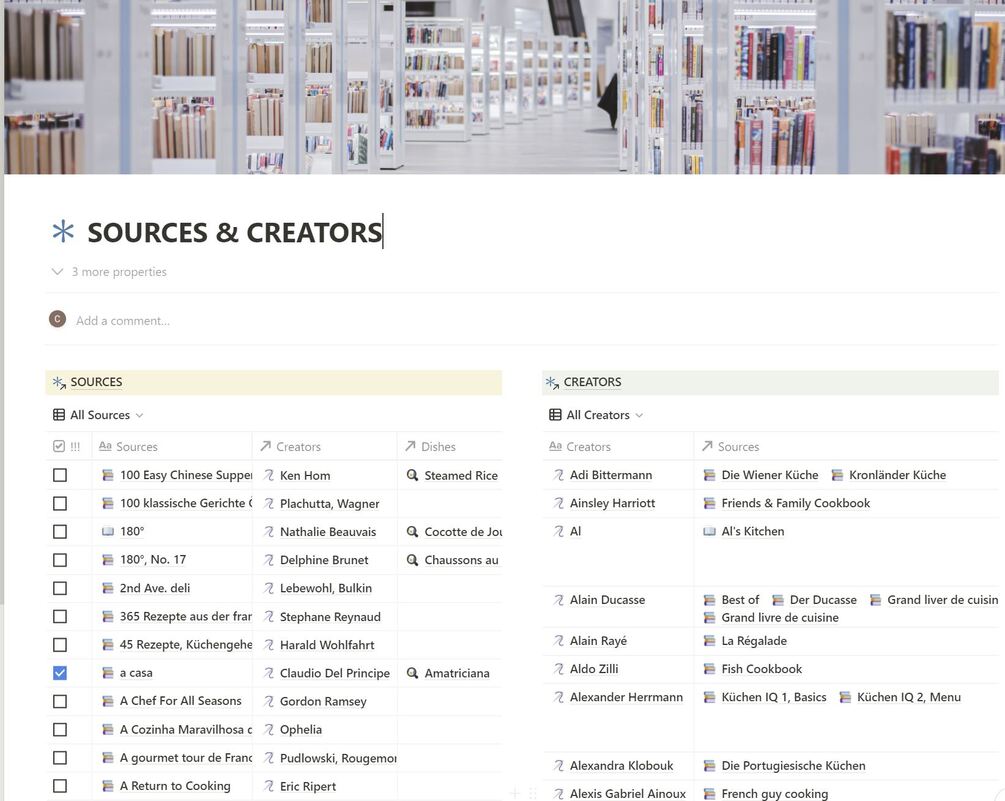 Be organized. You get a new book, enter the title in The Sources, The Creator (author) will be retrieved from - or newly edited in - The Creators. You want to quickly select and keep some recipes from that book. Enter them in The Kitchen. The source (eg book) and the creator (author) will be edited automatically. The Kitchen comes with abundant pre-installed views which reflect the way I am using the New Food Court, including recipes I want to do, recipes I will do very soon, new additions, sorted by authors, books, recipes I did very well and like to repeat or do regularly. As a user of Notion you will know how to adjust all of these views, or create new views, to cater your needs. Meal Planner and Shopping Lists are add-ons. Images shown are taken from my personal Food Court which meanwhile grew to contain more than 800 recipes and my entire cooking book collection. While I am taking photos of, or scan, the recipes and include those on the pages of the respective recipes, I needed to remove all of my private content for reasons of copyright protection. Therefore, the template comes basically as a blank template with a few examples. As a bonus, I integrated my book Designed to Cook (Vol. 1 - German language) in the Food Court. The English language edition can be downloaded from the folder DTC), more than 100 recipes of renown chefs in a new format: Cooking from top left to bottom right. A little cooking school.